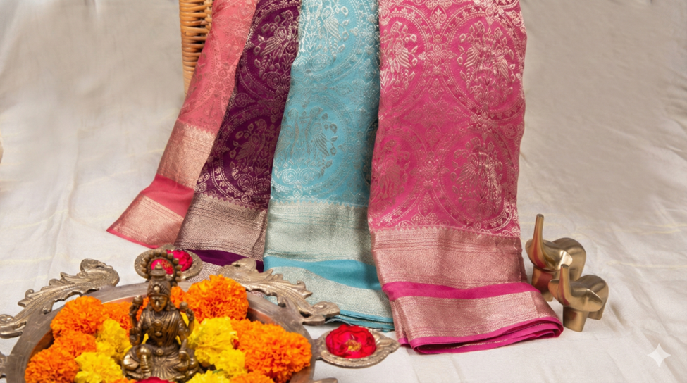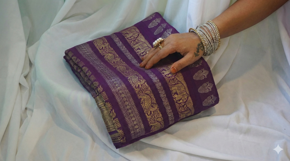 Heavy brocades can look magnificent, but they can weigh you down throughout the day. A lightweight Mysore crepe silk saree offers the perfect balance, elegant yet easy to carry. The smooth texture drapes effortlessly, allowing you to sit, move, and dance without tugging or adjusting every few minutes.